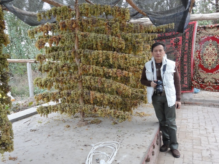 พวงองุ่นที่นำมาผึ่งเพื่อนำมาทำเป็นลูกเกด คนยืนข้าง ๆ ทำลูกเกดไม่ได้เพราะตากได้ที่เกินไป